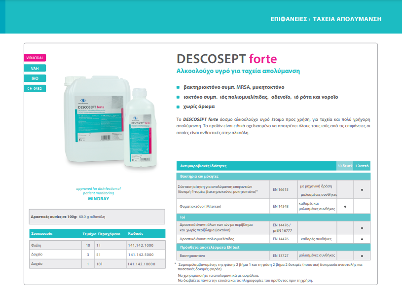 Το Descosept forte άοσμο αλκοολούχο υγρό έτοιμο προς χρήση, για ταχεία και πολύ γρήγορη απολύμανση.
