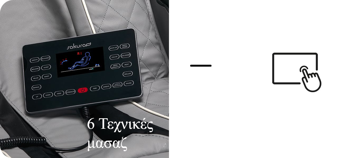 Η καρέκλα Sakura Comfort Plus χρησιμοποιεί έως και 7 αποτελεσματικές τεχνικές μασάζ: μάλαξη, έντονο μασάζ, σιάτσου, απαλό μασάζ, έντονη μάλαξη, βαθύ μασάζ και δόνηση (μασάζ ποδιών). Εδώ αξίζουν ιδιαίτερης προσοχής τα ακόλουθα: