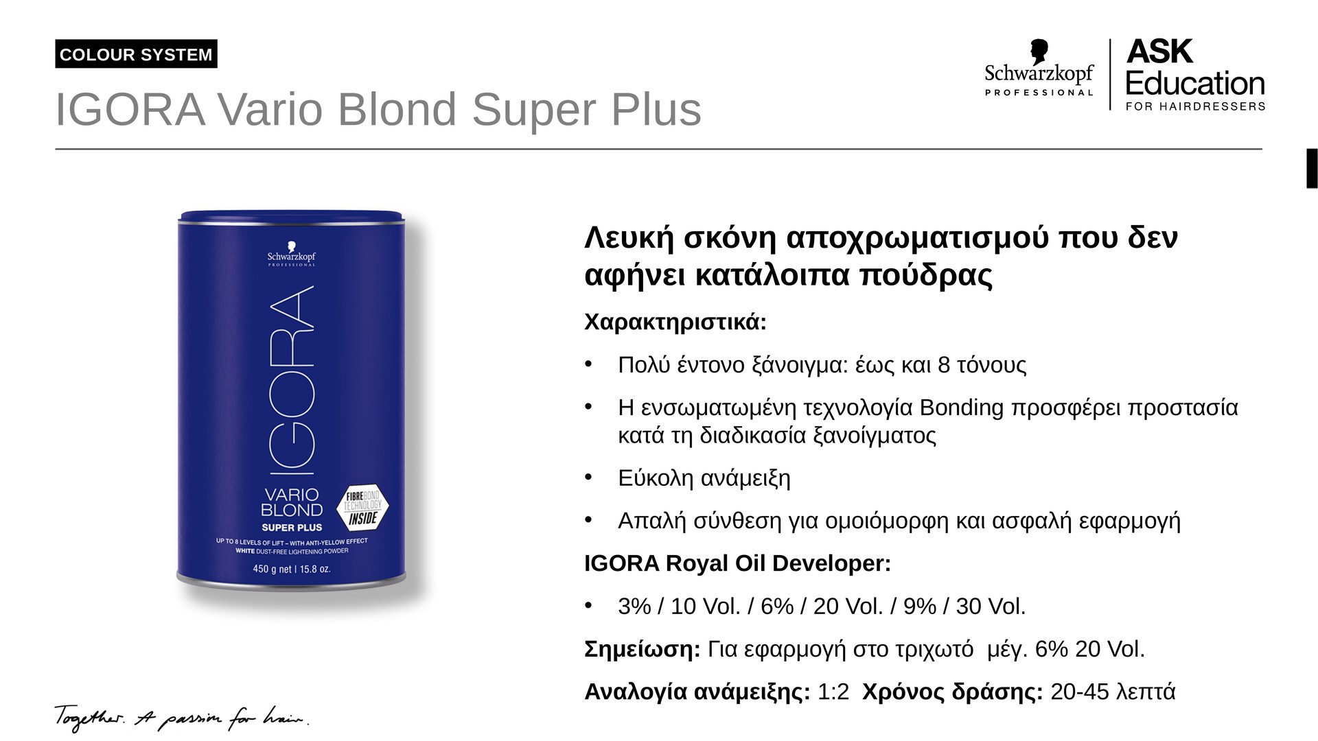 Σε ένα μη μεταλλικό μπολ, αναμίξτε 35 g ( 1 μεζούρα ) ξανοιχτικής σκόνης Igora Vario Blond Super Plus Powder Lightener με 70 ml (1: Igora Royal Oil Developer 3%, 6% ή το πολύ 9% ανάλογα με το απαιτούμενο ξάνοιγμα, μέχρι να πετύχετε μια απαλή κρέμα.